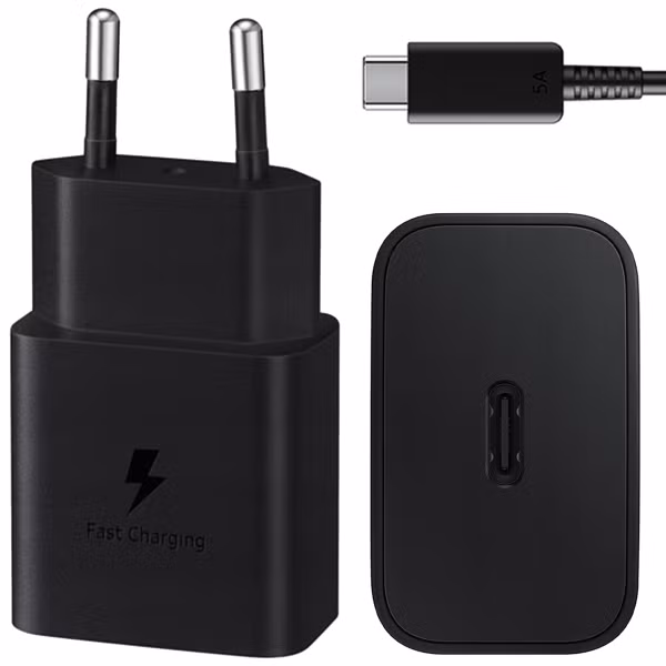 Samsung Adaptateur secteur original avec câble USB-C - Chargeur - Connexion USB-C et USB - Charge rapide - 15 Watt - 1 mètre - Noir