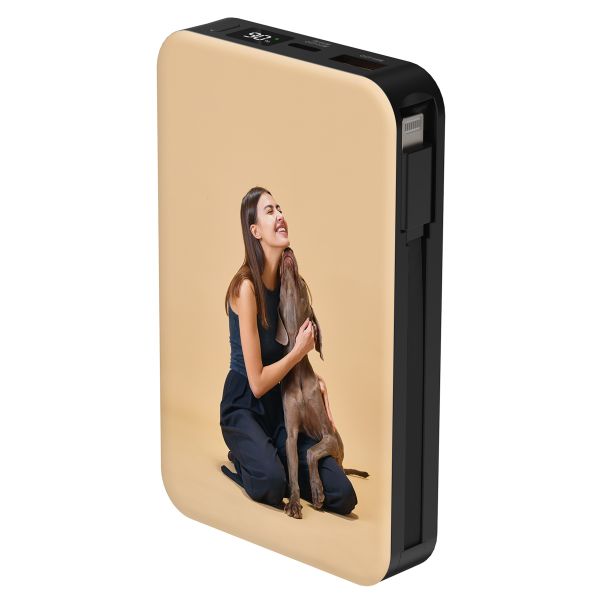 En ayant le contrôle total, tu crées une batterie externe unique que personne d'autre n'a. Ajoute ta propre photo ou texte, ou choisis parmi les designs existants, jusqu'à ce que le design soit entièrement à ton goût. Fini de concevoir? Ton design est imprimé en haute qualité sur le dessus de la batterie externe.