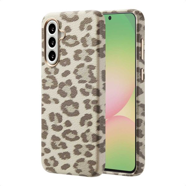 Cette coque arrière est fabriquée en cuir synthétique (PU) de haute qualité, réputé pour sa durabilité et sa résistance à la décoloration. Il est également facile à nettoyer. L'imprimé léopard vibrant reste beau longtemps et fait ressortir ton appareil. Les détails en aluminium, comme le contour de la caméra et les boutons, assurent non seulement une durabilité supplémentaire, mais créent également une apparence luxueuse parfaitement assortie.