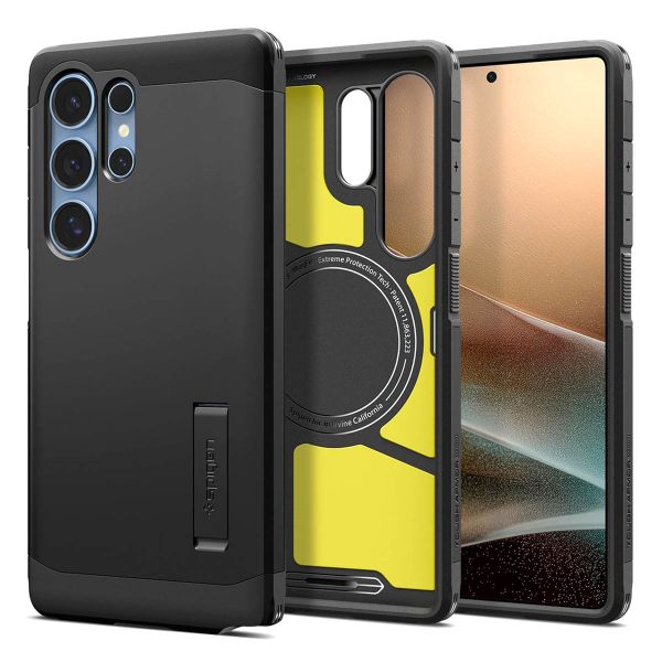 Offrez à votre téléphone une double dose de protection avec cette coque Spigen Tough Armor. La housse dispose d'une base en silicone doux et d'un blindage en polycarbonate puissant. Ensemble, cela assure la protection idéale contre les dommages causés par les chutes et les chocs. Ainsi, la housse satisfait même aux normes de test de chute militaires! Cette coque Tough Armor n'est qu'une fraction de son prédécesseur, la coque Slim Armor. La coque dispose d'un support amovible afin que vous puissiez regarder des films ou des séries sur votre smartphone de manière très confortable. Le caoutchouc intérieur est conçu de manière à garder la plaque arrière brillante et l'écran exempts de rayures lorsque vous posez votre appareil à plat. Du fait des évidements pour les boutons, ports et la caméra, vous utilisez votre téléphone comme à l'accoutumée. Grâce à la fonction intégrée MagSafe, vous pouvez facilement recharger votre smartphone sans fil.